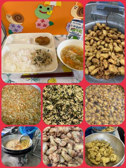 すまし汁は、うすあげ、キャベツ、玉ねぎ、たけのこ、にんじんを使用しています。お出汁が香りご飯に合う献立になっています。
