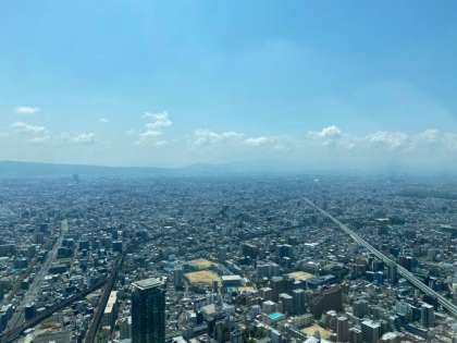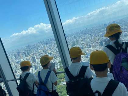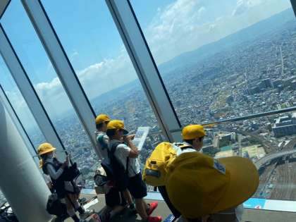 3年生は社会見学で、あべのハルカスへ。梅雨の晴れ間で、遠くまでよく見えます。北方面を見学しています。