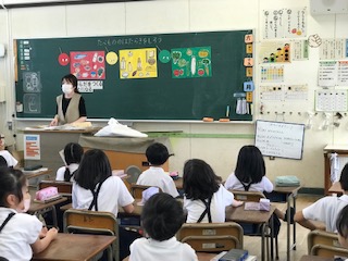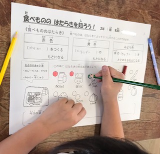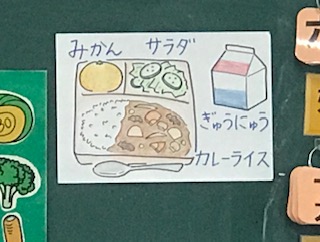 他校から栄養教諭を招き、各学年で食育や栄養に関する学習をしていただきます。第1回目は2年生の学習でした。食品は主な栄養素で分類され赤・黄・緑で表せることをなどを学びました。カレーの材料を栄養素別に色分けするお試し練習もしました。