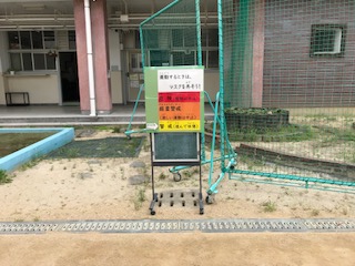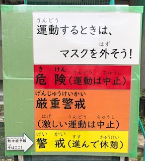大変暑くなり、熱中症に気をつけなければならない時期を迎えました。学校では、運動場に看板掲示を作り、子ども達に注意喚起を促しています。数時間おきに熱中症指数を確認して分りやすく示します。