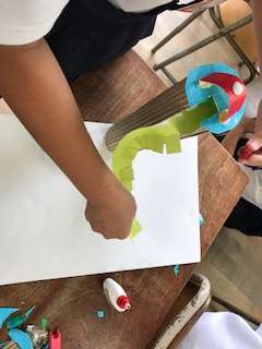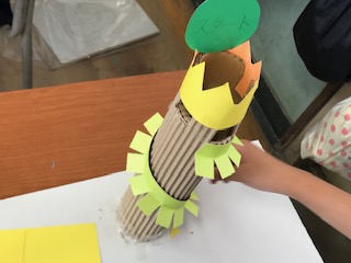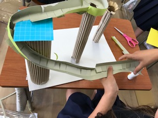 道を取り付けて、ビー玉が転がるタワーを作っています。うまく転がるように傾きやねじり方を考えて進めています。できあがったら、楽しく遊べそうですね。
