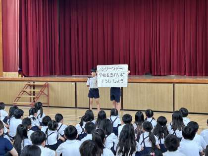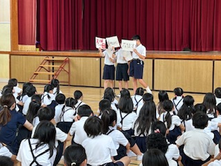 月曜日の児童朝会では、委員会がお知らせを発表しました。全員に伝わりやすいように、文字に書いて工夫しています。よくがんばっていました。