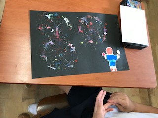夜空を美しく彩る夏の風物詩、花火です。絵の中に、ゆかたを着て花火を眺める自分も登場させています。それぞれが好みの衣装を身につけています。画面に人が登場!これだけで随分、作品に温かさが加わるので不思議ですね。