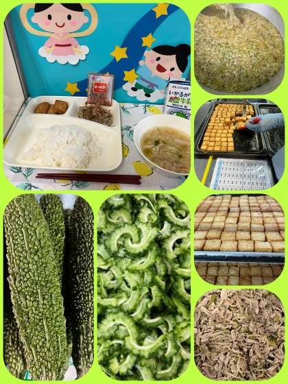 ゴーヤチャンプルーは、年1回だけ7月に、使用できるにがうりを使った沖縄料理です。食べる前に小袋のかつおぶしをかけることで、風味と旨みがくわわります。