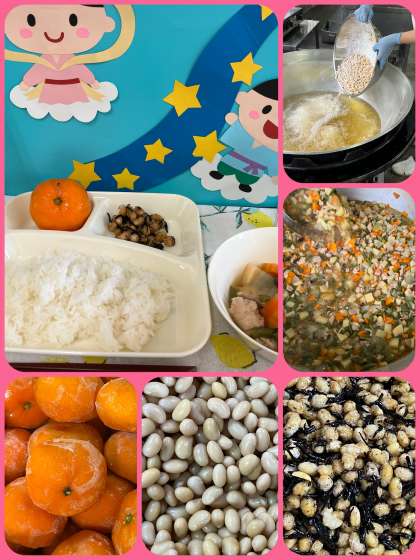 鶏肉と野菜の煮ものは、鶏肉、じゃがいも、玉ねぎ、にんじん、たけのこ、しいたけ、青みにさんどまめを使用しお出汁の風味がした煮ものです。それにひじき豆と冷たく口当たりのよい冷凍みかんを組み合わせています。