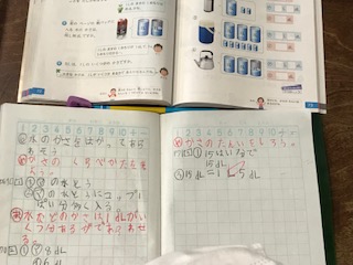 かさについて学習しています。初めての単位やその変換は、慣れるまで、少し難しいかもしれませんが、ノートもていねいに書いて、がんばっています。