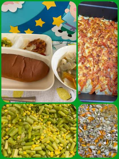 じゃがいもトマトのチーズ焼きは、子どもたちに好評な献立で生のトマトを使用しています。トマトの酸味とベーコンやじゃがいもの旨みが出ている献立になっています。