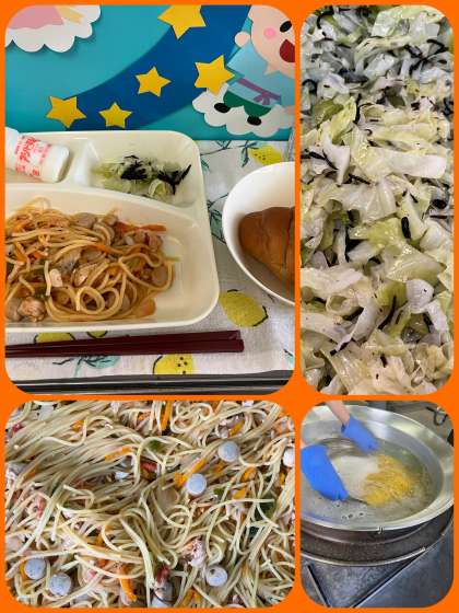 チキントマトスパゲッティは、1学期最後の給食にふさわしく好評な献立でした。これにキャベツのひじきドレッシングと発酵乳が1人1本つきます。