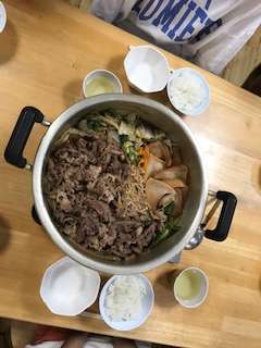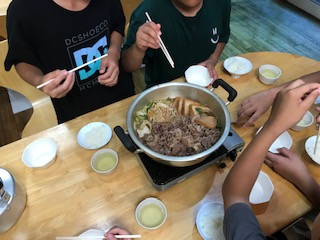 すき焼き鍋の定食。箸の使い方やマナー、感染防止対策を説明してから、いただきます、をしました。みんな、お腹ペコペコです。が、仲良く分け合って食べています。