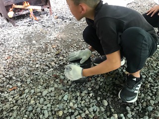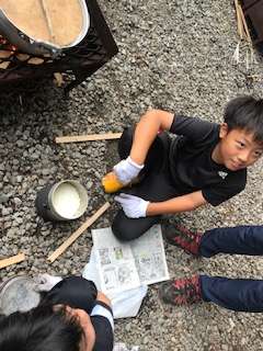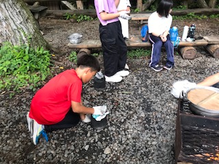 ご飯が出来上がり始めています。飯ごうが熱いうちに、同時にすすを拭き取らないといけないので、大変です。最終作業に入り始めました!