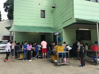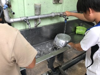 おいしくいただいた後は、しっかりお片付けタイムです。いつもの道具とは違って、すす落としに大変です。が、みんなが本当によく頑張っています。ピカピカにしています。