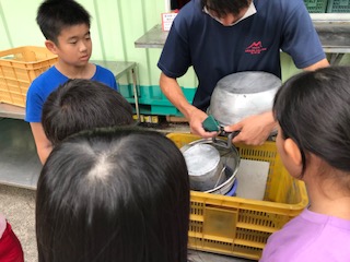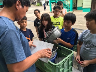 洗い終わった後の、調理器具の汚れと焦げ落としのチェックです。これが、なかなか、難しいのです。細部まで磨かなければ、もとの状態にはもどりません。粘りが必要な後片付けの活動です。が、本当によい体験学習です。