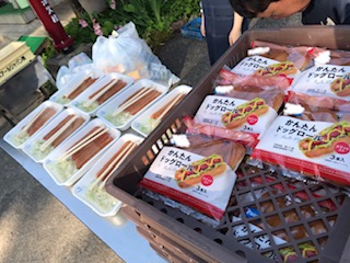 カートンドックを今からつくります。ソーセージとキャベツを挟んで、アルミホイル、牛乳パックを使って火で温めます。どんな朝食になるかな?