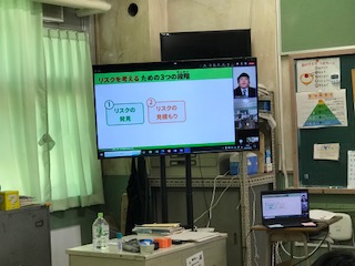 今日は、ドコモより講師を迎え、5年生がスマートフォンによるSNS・インターネットの正しい使い方とモラルについて学びました。出前授業ではありますが、今回はオンラインによる授業です。モニターには、講師先生と隣のクラスの様子も映っています。学ぶ様子や質問への反応の様子を互いに知ることができました。モニターを見て話をよく聞いていました。