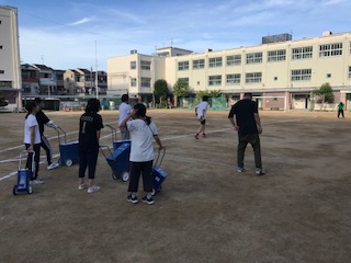 一週間が終わる金曜日、放課後の校庭です。会議後も、先生達が月曜日からの運動会練習のために、ラインを引いています。とても美しいフィールドとトラックができました。雨が降りませんように。