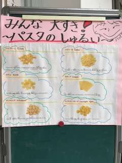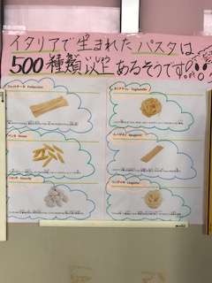 そのほか、調べてみるとパスタの発祥は、古代ローマ時代のイタリア。種類は500以上…など、なかなか興味深いものです。調べた結果はまとめて、校長室の前に掲示にしました。