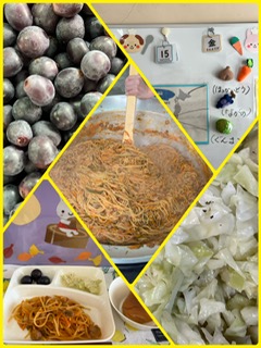 「イタリアンスパゲッティ」は、豚肉、ウインナーを主材に、玉ねぎ、にんじん、ピーマン、マッシュルームを使用したケチャップ味のスパゲッティです。これに年1回の「ぶどう【巨峰】」がついています。