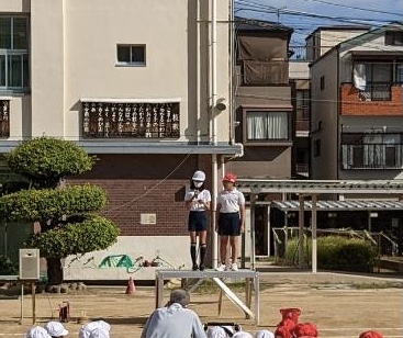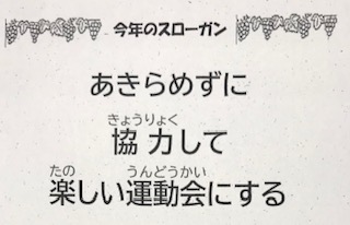 運営員会からは、運動会のスローガンが発表されました。「あきらめずに、協力して、楽しい運動会にする」今年、子ども達が考えたスローガンです。みんなやる気一杯です。