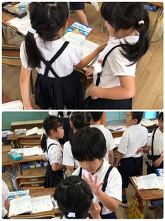 1年は数え方に慣れる練習をしています。2とび、5とびなど、友達や先生に聞いてもらい、何度も唱えています。慣れて、歌を歌うようにスラスラ楽しくいえています。おうちでも、聞いてあげてください。