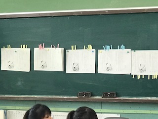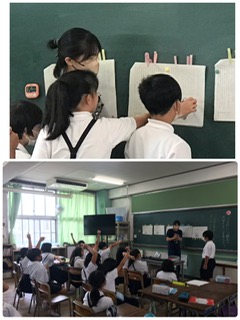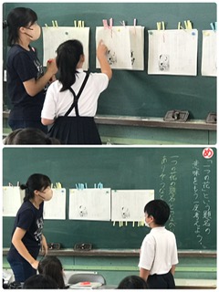 どうして 一つの花 という題名がついたのか?キーワードをもとに、話し合いです。単元もクライマックスを迎えています。それぞれが自分の意見を述べ合い深め合う授業でした。教材も提示の仕方をされています。