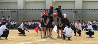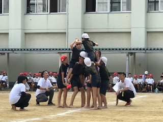 騎馬戦で子ども達の安全を見守る教員です。子ども達の様子を見るその眼差しと姿に、先生達の熱意と優しさ、頼もしさを感じます。素晴らしい本校のスタッフです。先生達も子ども達と思いを同じくする運動会です!