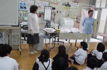 その後、保健室でフッ化物塗布を行いました。佐藤先生にフッ化物のマウスピースを口に入れていただくと、みんな眉間にしわを寄せながら、3分間砂時計が落ちるのを待っていました。がんばって歯みがきをして、つるつるの歯にフッ素を塗布することできました。