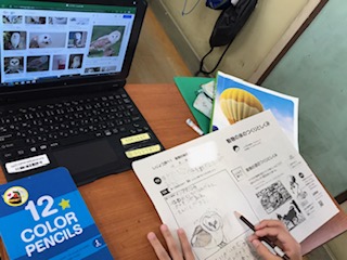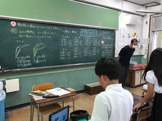人間を含めた動物の体のつくりやその違いを学習しています。背骨があるかないか?など、タブレットや資料を調べて確認し、ワークシートにかきこみながら、学習しています。