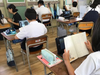 この活動で、タブレット登場です!自分の読み方を録音して、後から聞き比べるのです。