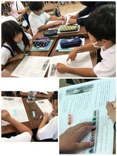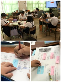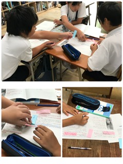 大造じいさんの気持ちが分かる表現を、赤鉛筆、青鉛筆で色分けして線を引き、班で話し合い付箋を使ってまとめています。細かい表現を見落とさず、気持ちの読み取りにつなげています。