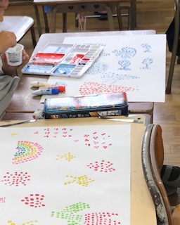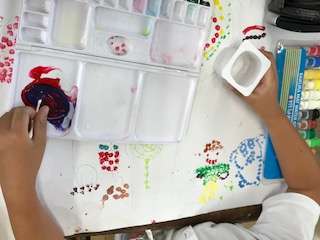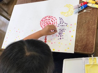 綿棒で、点描画を描いています。この、絵の具にしかけがあるようです!のりを混ぜています。