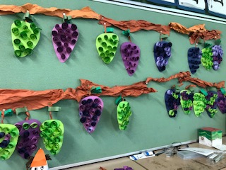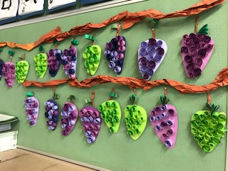 美味しそうなマスカットと巨峰が仕上がり、教室に掲示されています。今にも、香りが漂ってきそうです。立体作品が本物のようで迫力がありますね。