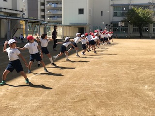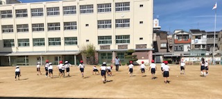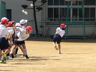 体育で、2年生がボール投げを練習しています。こちらも投げる動きやタイミングをつかみ、フォームもかっこよくなってきました。