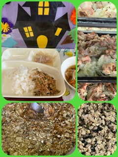 「ツナ大豆そぼろ」は、ツナ、ひきわり大豆、青みにだいこん葉を入れていため、しょうゆ、砂糖で味付けしたごはんにとっても合う献立です。これに沖縄の郷土料理の「ソーキ汁」がつきます。