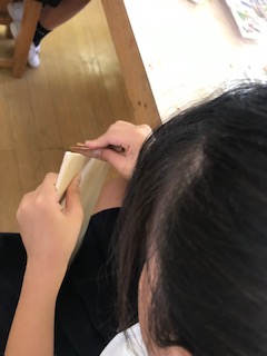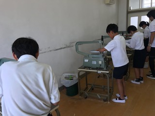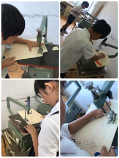 図工で、初めて学習した工具の「電気のこぎり」ですが、正しい使い方を身につけ、安全に使うための約束を守って、とても上手に進めています。コツをつかんで、細かい部分の操作もスムーズにできるようになっています。並んで作業する姿が、とてもカッコいいですね。