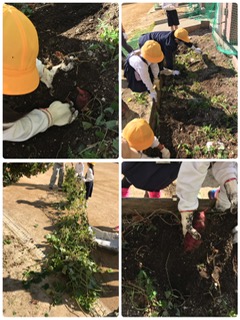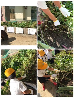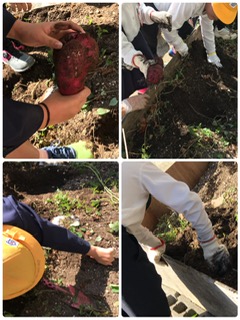 今日、昼休みにフレンズのみんなが、教室前の畑に植えたいもをほりました。まず、ツルを引いて土が見えたら、掘り起こしです。大きなさつまいもを見つけて力一杯、ぬいていました。金曜日に料理して食べますが、今から楽しみです。