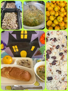 「中華スープ」は、鶏肉、豆腐、野菜など入った彩りのよいスープに仕上がっています。これにみかんがついています。
