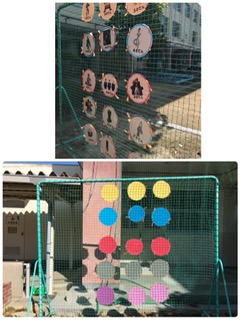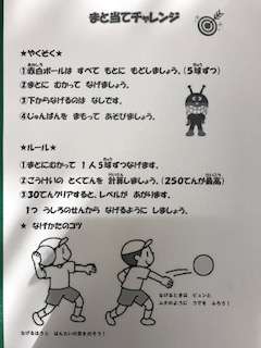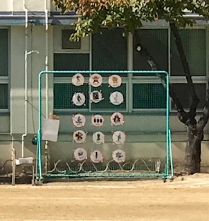 投げる能力を高めるために、まと当てが今日から登場しました。子ども達のため、体育担当の先生が心をこめて工夫して作ったものです。約束を守って、仲良く、楽しく使ってくださいね。裏もカラーでとってもおしゃれです。