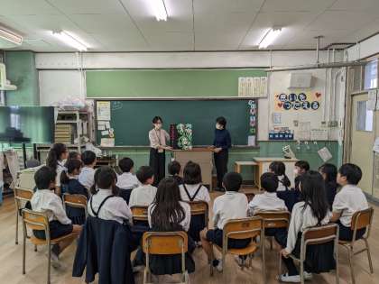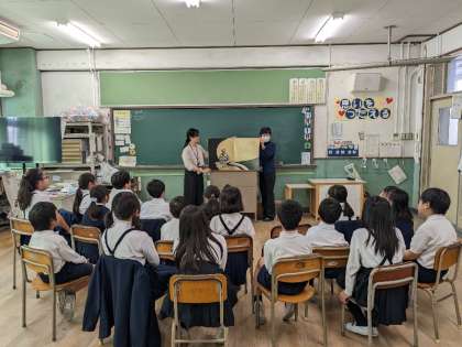 今日の2,3時間目、平野図書館「おはなしたからばこ」の方に本を読んでいただきました。
