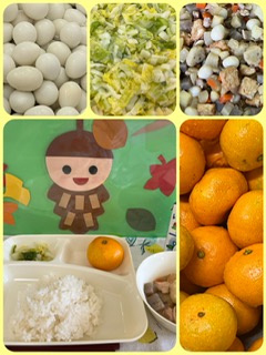 関東煮 はくさいの甘酢あえ みかん ごはん 牛乳