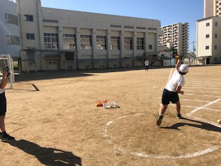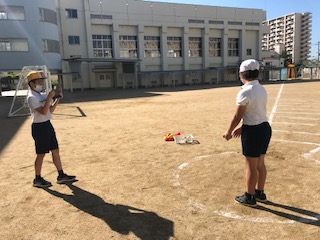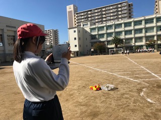 投の運動練習を重ねて、今日は記録の日です。タブレットで、一人一人投げ方のフォームも記録しています。後から自分で振り返ることができ、課題を考えながら力を伸ばせますね。