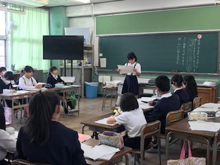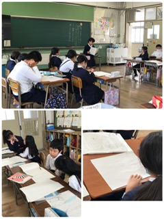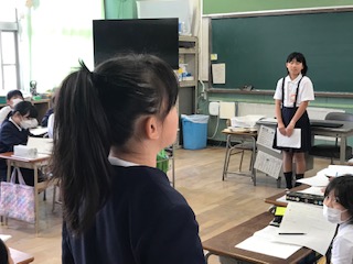 昨日のホームページで紹介した、自作「スピーチ」の発表会です。単に発表するだけではありません。聞いている人に感想や質問を投げかけ、互いに話を盛り上げます。感想を書いたり聞き手同士で話し合う活動も工夫されていました。