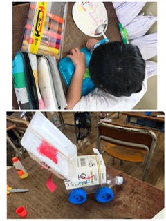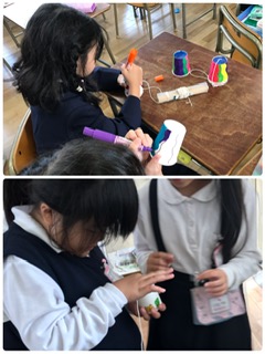 糸電話や車など、いろいろな「手作りおもちゃ」が完成してきました。自分たちで試し遊びも楽しみながら改善しています。とても素敵な作品ですね。
