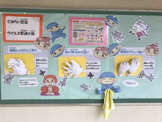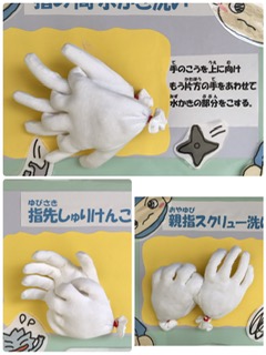11月の給食室前掲示「手洗いについて」です。給食担当職員(事業担当主事)が作成しました。いまにも動き出しそうな手の立体掲示は、芸術作品のようです。