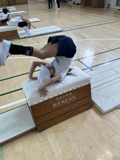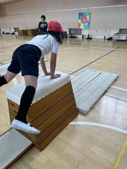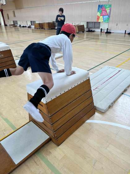 3年生では、4段・5段の「開脚跳び」と跳び箱を低く積んだ「台上前転」に挑戦しています。踏み切り後、跳び箱の前方に手を着き、大きく脚を広げ、腰をしっかり上げることがうまく跳ぶコツです。よく考えて練習していました。