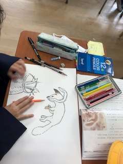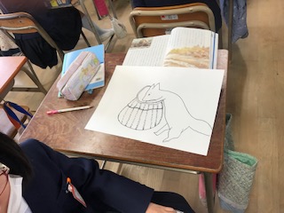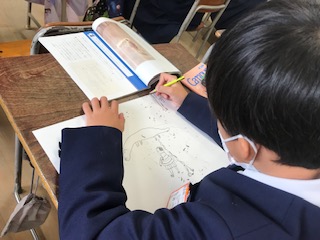 心に残った場面を絵にしています。教科書を参考にしながら描いています。最後に、どんな作品ができるのか楽しみですね。