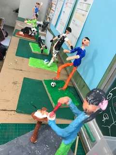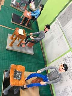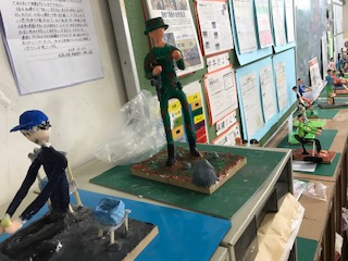 芯を人の形にして、動きを作り、粘土をつけ色をつけ、作品にしています。周りの道具も細かく作られています。作品展での披露を待っています。