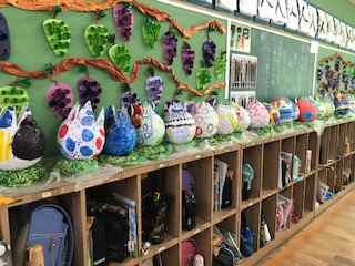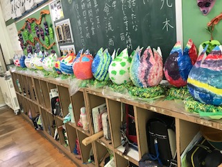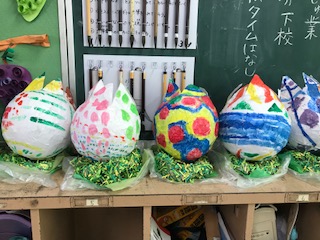 以前紹介しましたが、真っ白で丸いボール状の紙玉は今、このように変化しました。カラフルな卵の殻は上部が開いています!さて、これからどうなるのでしょうか?作品展では、どんな姿になるのでしょう?