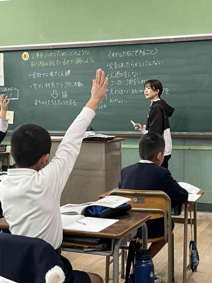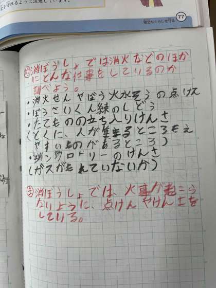 社会の学習で、火事が起きた時にどのような人が動いたり、火事が起きないように、日頃からまちを守る取り組みをしている人がいたりなど、沢山の人が火事について考え、活動していることを学んでいます。