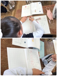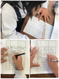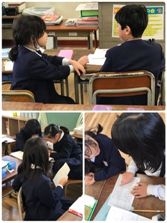 国語の教材「同じところ ちがうところ」で、よく似たもの2つを性質などの項目に分けて比べる学習です。例をもとに、一人一人が比べるものを決めて表をつくり、その後、話し合いでアドバイスなど上手にしていました。ものによって、比べかたに違いがあることにも気づいたようです。