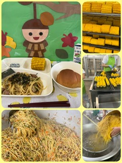 ウインナーときのこの和風スパゲッティ 焼きとうもろこし 固形チーズ 黒糖パン1/2 牛乳
